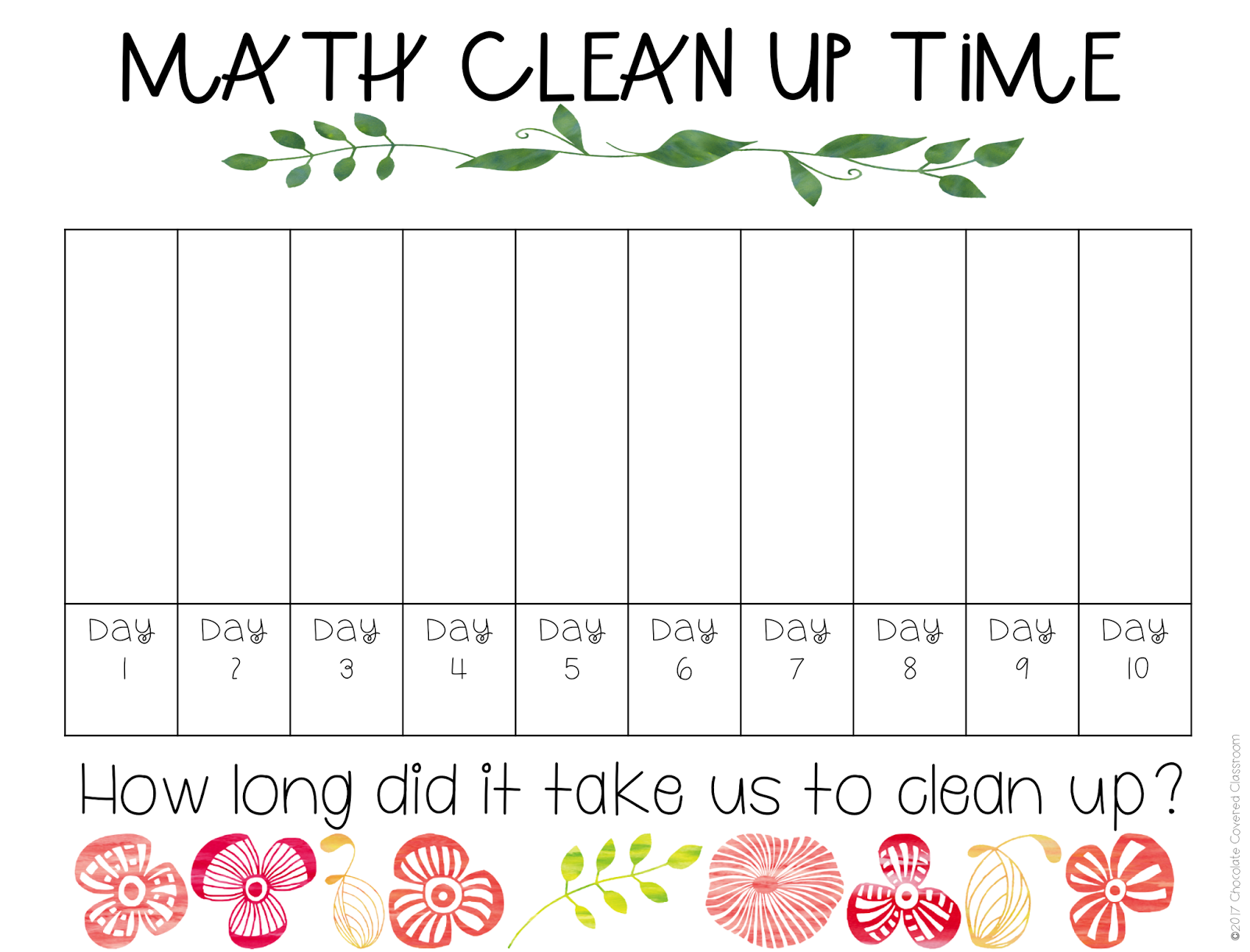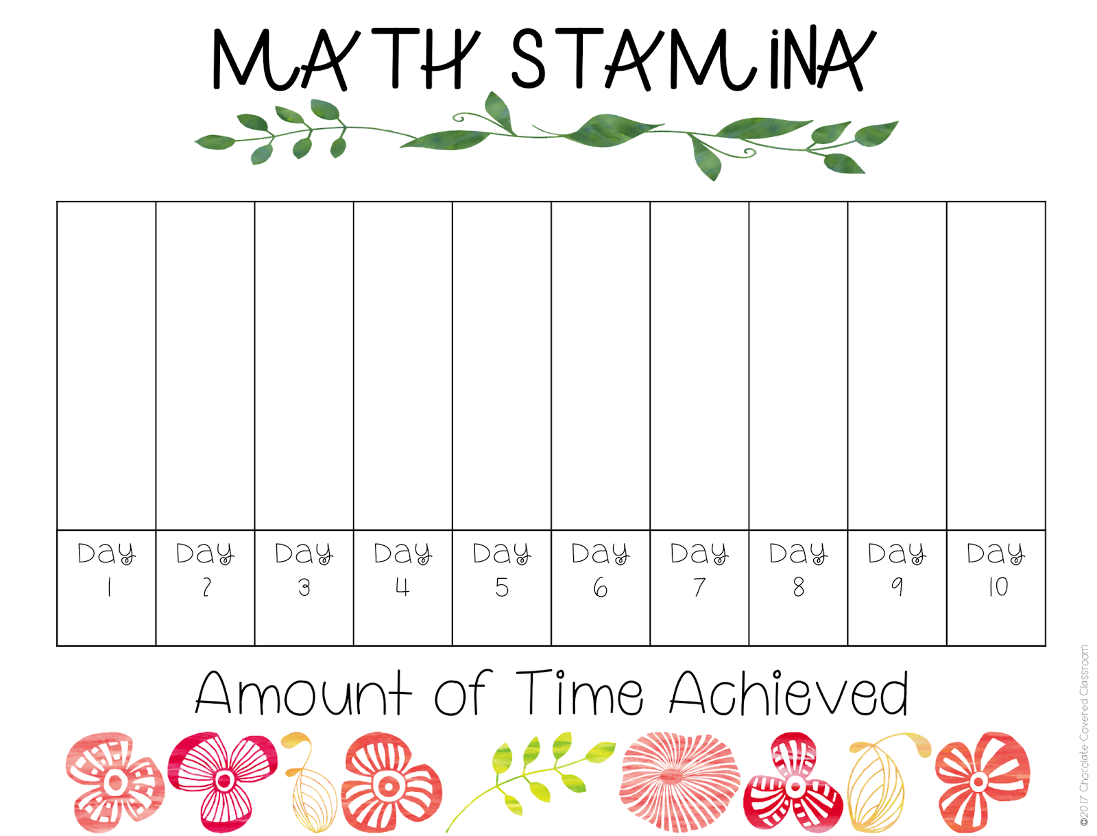 Once we are all back at the carpet, we celebrate the amount of math stamina that we had and the time that it took us to clean up/ get started. Then I ask for suggestions on what we could do next time to increase our stamina and decrease our clean up/ getting started time. Lastly, we track all 3 numbers on our stamina charts. If there is still time left in the class, we try again, this time aiming to build our stamina a little bit more!